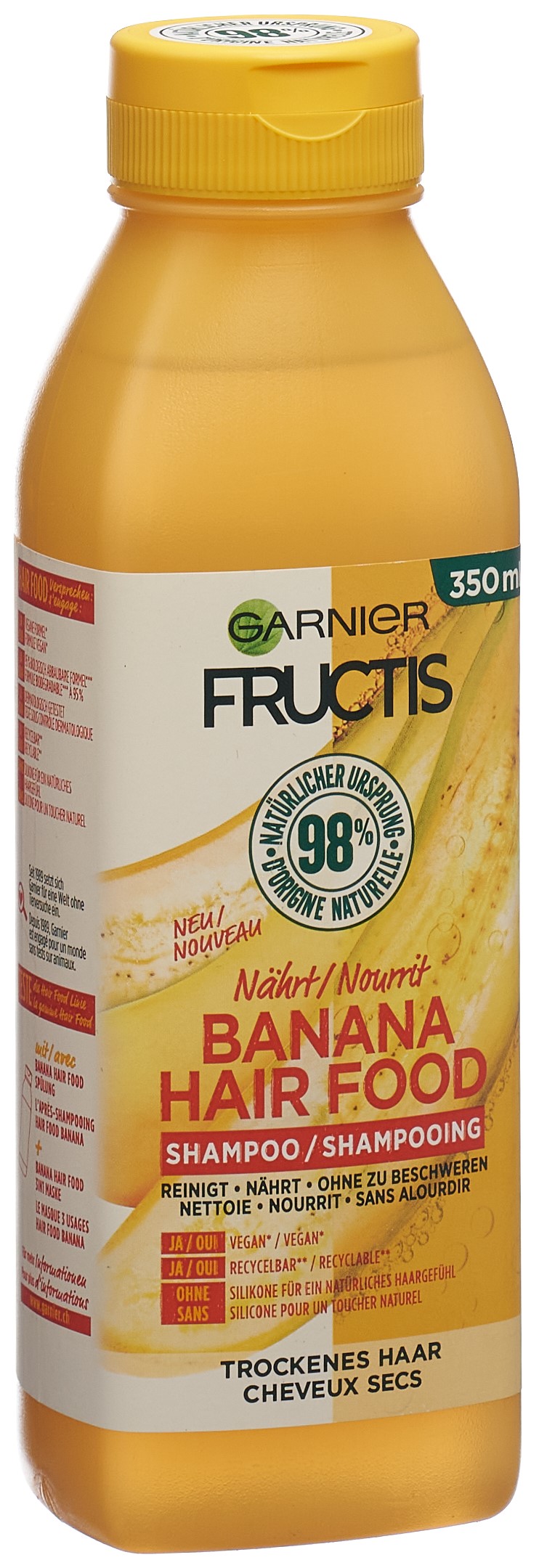 Fructis entwickelt ein veganes (ohne Inhaltsstoffe tierischen Ursprungs) Hair Food Shampoo mit 98% Inhaltsstoffen natürlichen Ursprungs*. Der leichte Schaum reinigt das Haar sanft und nährt es ohne zu beschweren!