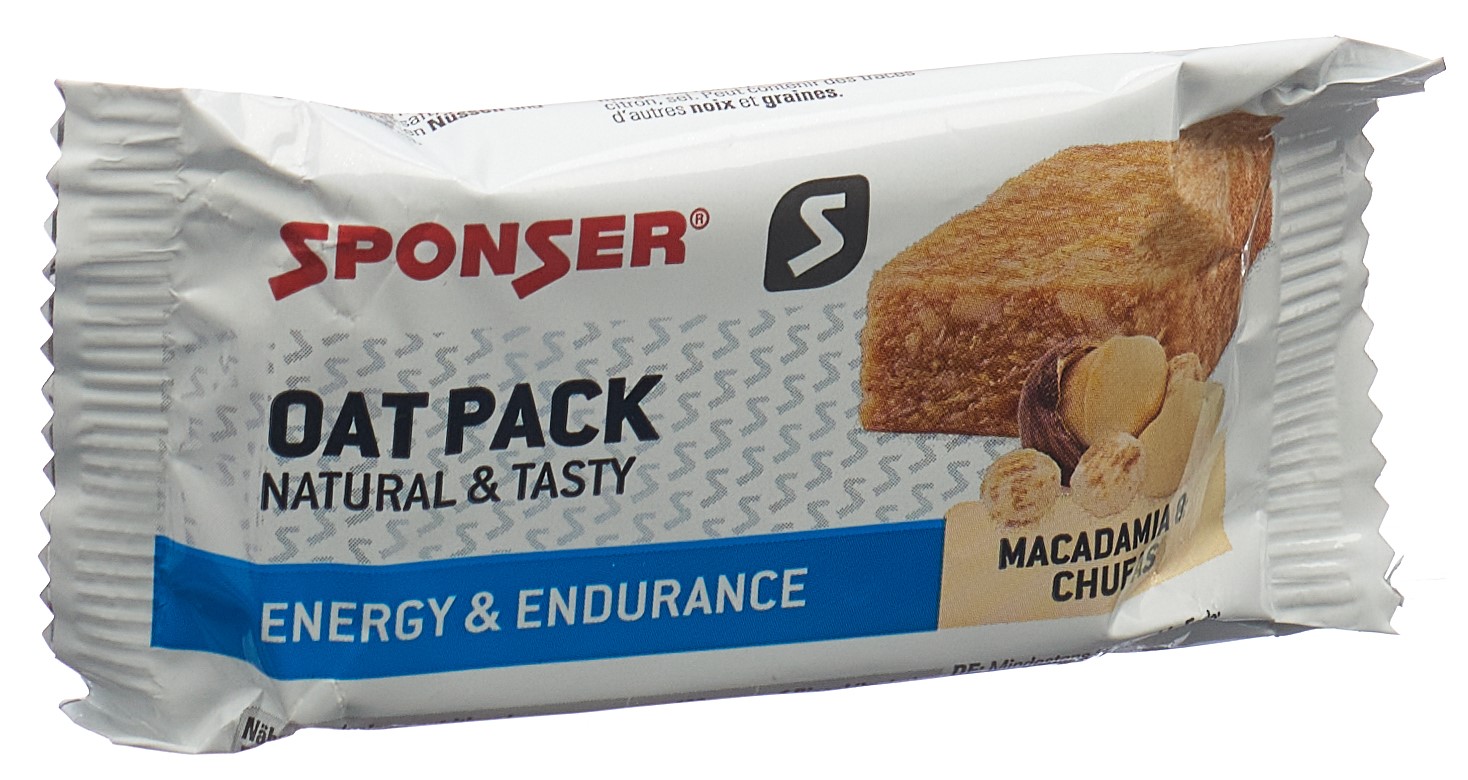 Sponser Oat Pack – Geballte Energie aus Hafer. Haferflocken kombiniert mit gerösteten Chufas (Erdmandeln) oder Caramel, liefern Energie. Haferflocken sättigen langanhaltend, da sie lösliche Fasern enthalten, welche gelbildende Eigenschaften haben. Geeignet als schmackhafte Verpflegung auf Biketouren, beim Wandern oder Trekking, aber auch bei der Arbeit oder im Alltag.